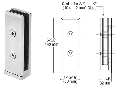 Klemmbefestigung für 6 bis 12 mm Glas, mit flacher Auflage, rechts und links verwendbar, mit Gummieinlagen und Sicherungsschrauben.
